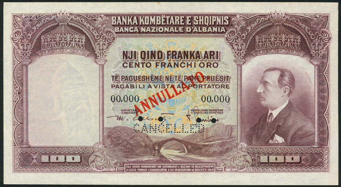 (x) Banca Nazionale d'Albania, specimen 100 franga ari, ND (1926), serial number 00000, purple-brown, King A. Zogu at right, Gomsiqe Bridge at centre, reverse blue-green and lilac, landscape at centre, red overprint ANNULATO. and perforated CANCELLED