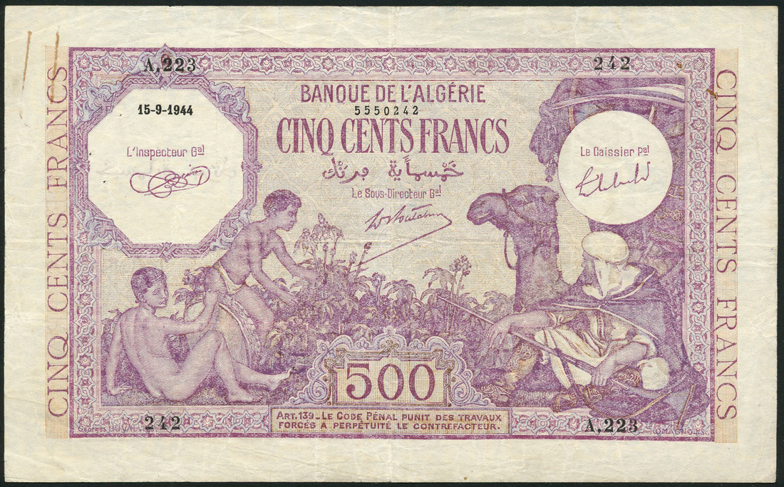 Banque de l'Algerie a group comprising 5 francs, 1941 (3), 20 francs, 1928, 1939, 50 francs, 1936 and 1937, one with TUNISIE overprint, 5 francs, 1942, 20 francs, 1943, 500 francs, 1944, serial number A.223242, 5 francs, 1944, 50 centimes, 1944, 10, nouveaux francs, 1961, 5 dinars 1971, 50 francs, 1940 with TUNISIE overprint