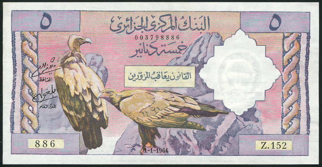Banque Centrale d'Algerie, a group comprising 5 dinars, 1964, prefix Z.152 (2), purple, 10 dinars, 1964, prefixes L.1960, X.1639, 100 dinars, 1964, prefixes G.81, U.1077,