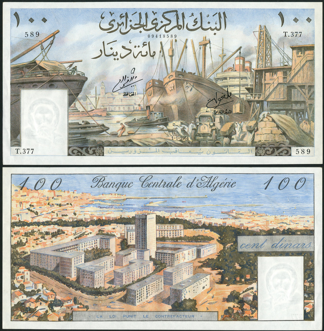 (x) Banque Centrale d'Algerie, 100 francs, 1964, prefix T.377, multicoloured, port scene, reverse aerial view of city