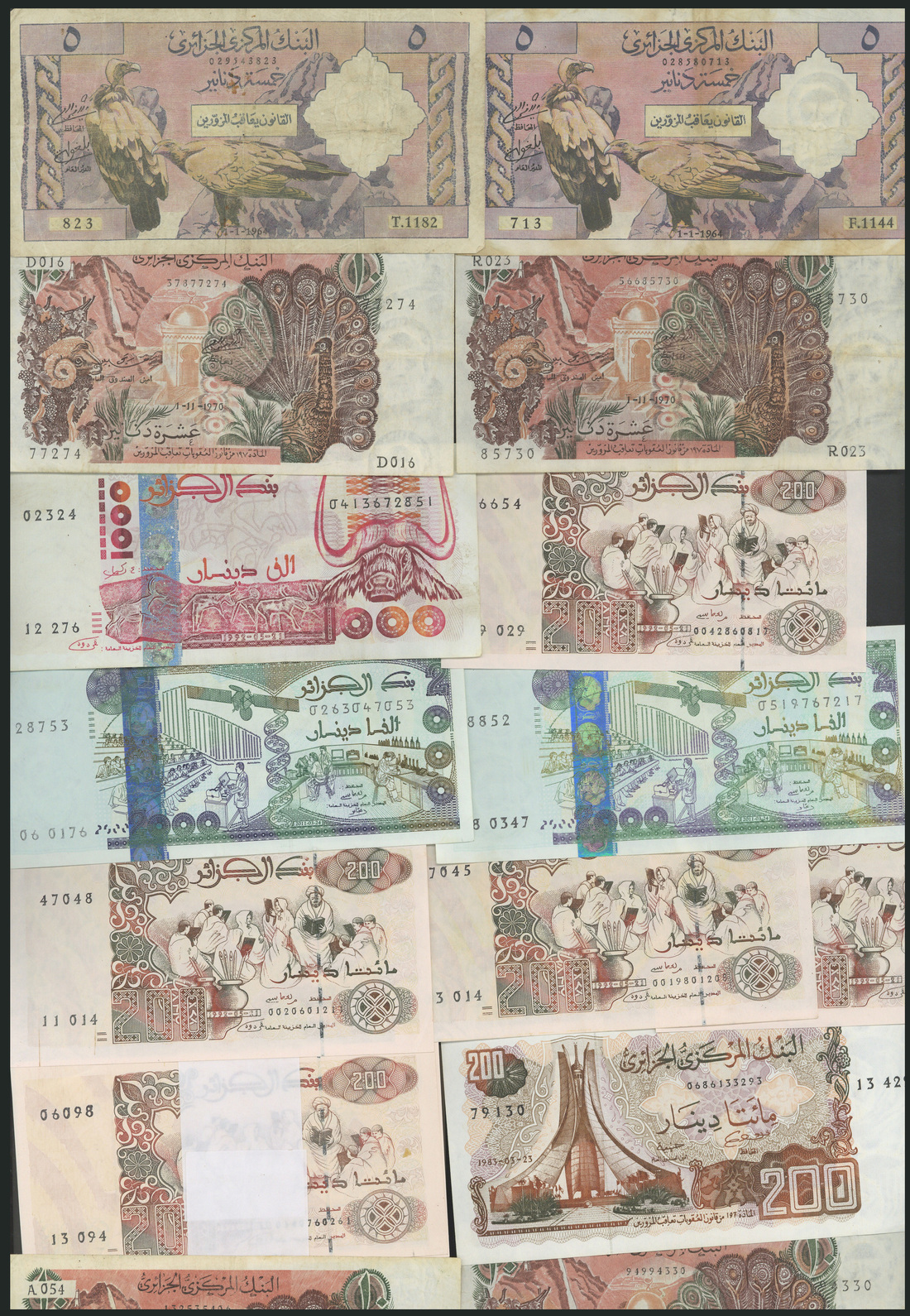 An extensive collection of more modern Algerian notes, including 5 francs, 10 francs (44), 100 francs (12), 500 francs (15), all from the 1970 issue, 20 dinars (53), 1983, 50 dinars (15), 1977, 100 francs, 100 dinars (11), 1982, 200 dinars (28), 1983, 100 francs (11), 200 dinars (105), 1992, 1000 dinars (3), 2005, 2000 dinars (3), 2011