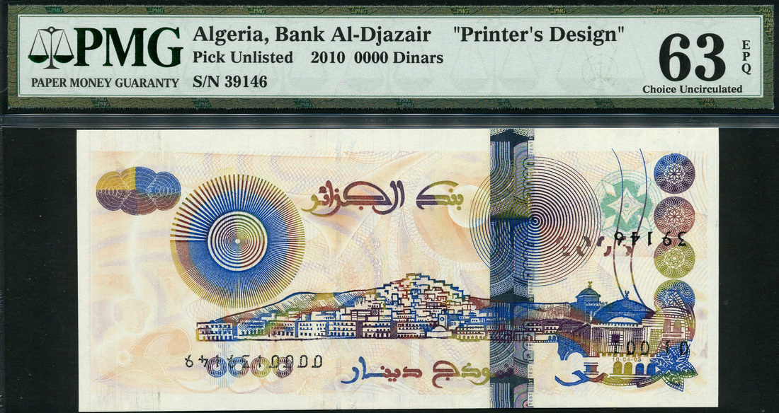 Bank Al-Djazair, Algeria, printer's design 0000 dinars, 2010, serial number 39146, dark blue on multicolour underprint, sketch of city at centre, circular patterns at left and right, building low left, reverse, bright and colourful with denomination low left, Arabic text with stylised city in background