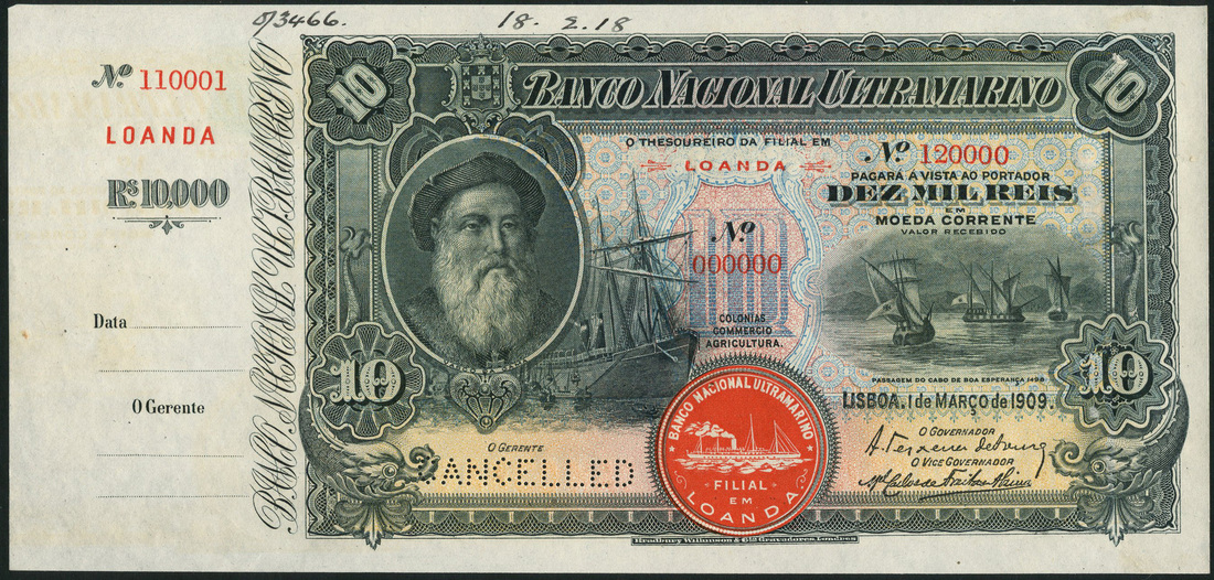 Banco Nacional Ultramarino, Angola, printer's archival specimen 10 Mil Reis, 1 March 1909, with counterfoil, serial number run 110001 to 120000, signatures of Antonio Teixeira de Sousa as Governor and Manuel Carlos de Freitas Alzina as Vice Governor, black and multicoloured, portrait of Vasco da Gama at left, his passage round the Cape of Good Hope at right, Steamship Seal Type 1 at lower centre, red overprint LOANDA at upper centre, reverse brown, woman seated on anchor looking out at ships, perforated CANCELLED