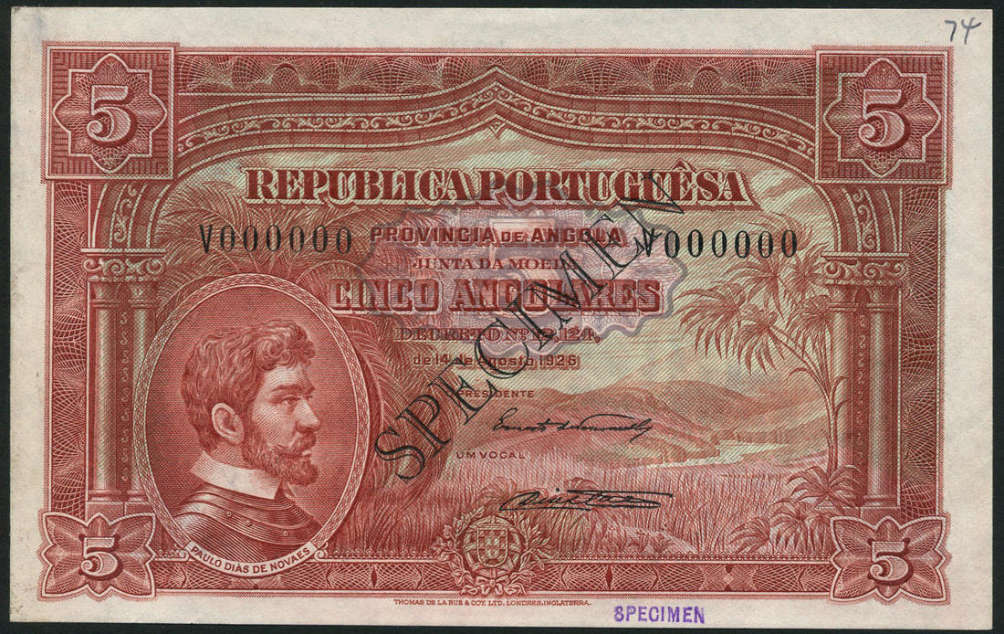 (†) Republica Portuguesa, Angola, specimen 5 angolares, 14 August 1926, serial number V000000, red on pink and green underprint, Paulo Dias de Novaes at left, value at corners, reverse red, Elephant at centre, small purple and large black SPECMEN stamps