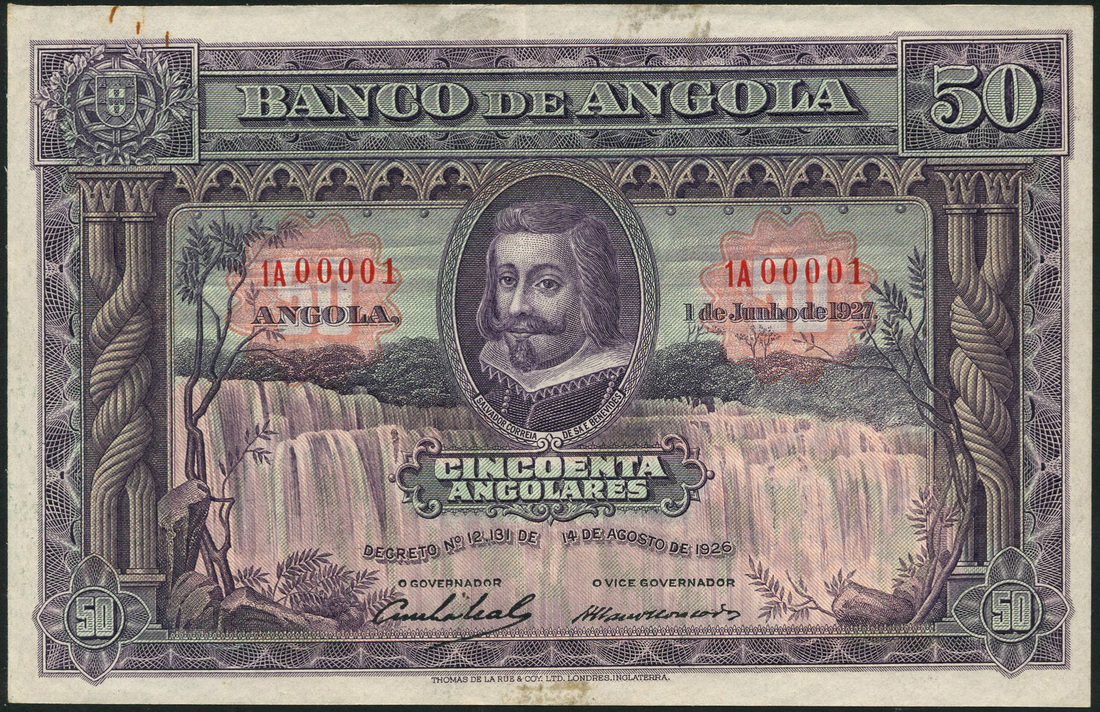 Banco de Angola, 50 angolares, 1 June 1927, serial number 1A 00001, purple on lilac and green, Salvador Correia in oval frame at centre, waterfall in field, arms top left, column at left and right, reverse violet on green, leopard at centre, Francisco P.C. Leal and Albano Seiça Moncada signatures