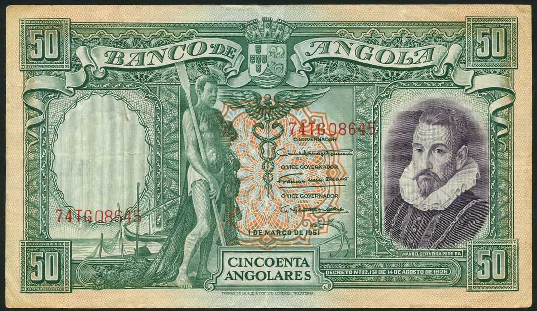 Banco de Angola, 50 angolares, 1 March 1951, red prefix 76T, green and orange, native and arms at centre, Pereira at right, reverse green, also specimen 100 escudos, 1956, blue and multicoloured, Pinto at right
