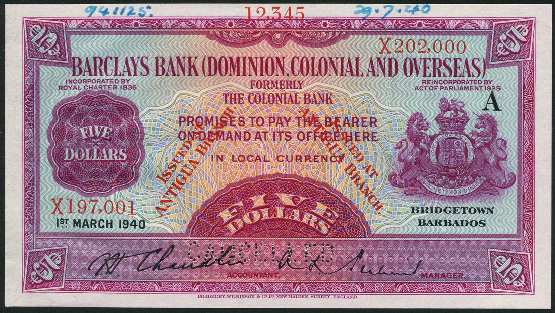 (†) Barclays Bank (Dominion, Colonial and Overseas), Antigua, printer's archival specimen $5, 1 March 1940, serial number run X 197,001 to X 202,000, Letter 'A' for Antigua at upper right, purple on pale blue and multicoloured underprint, value in guilloche at left and in each corner, coat of arms at right, reverse arms at centre, perforated CANCELLED