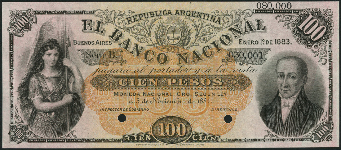 (†) El Banco Nacional, Argentina, printer's archival specimen 100 Pesos, 1 January 1881, serial number run 030,001 to 080,000, no signatures, black and orange on lilac underprint, portrait of J. J. Paso at right, allegorical maiden representing liberty at left, reverse rose, green and black, rural scene with cattle at centre, value at left and right and in each corner, two punch holes