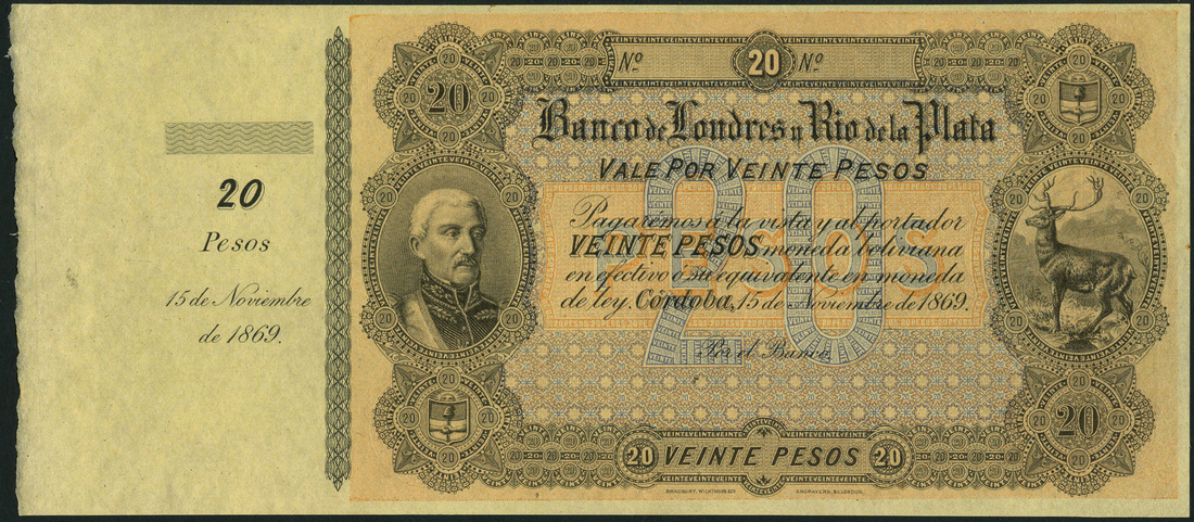 (†) Banco de Londres y Rio de la Plata, Argentina, specimen 20 Pesos, 15 November 1869, with counterfoil, no serial numbers, no signature, black, yellow and multicoloured, portrait of General Belgrano at left, stag at right, reverse brown-purple and yellow, value at centre and in each corner