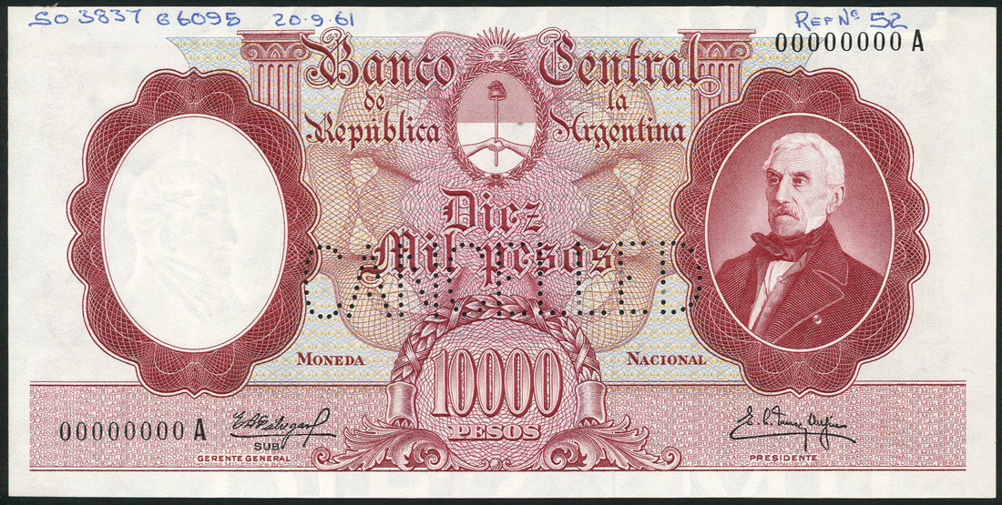 (†) El Banco Central, Argentina proof 500 pesos, 1935, no serial number, blue, proof 100 pesos, 1935, purple, proof 1000 pesos, 1935, no serial number, purple, specimen 10000 pesos, ND ( serial number 00000000A, red, all feature portrait General Jose de San Martin at right, arms top centre, value in text and numerals at centre