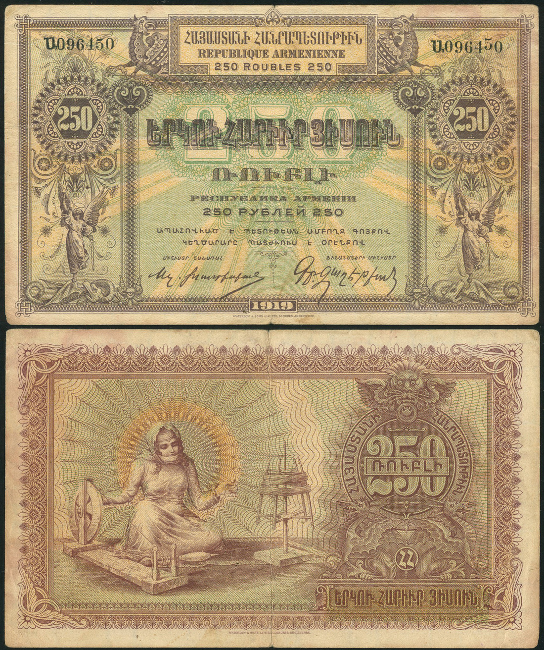 (x) Government Bank, Armenia, 250 rubles, 1919, serial number 096450, violet and green