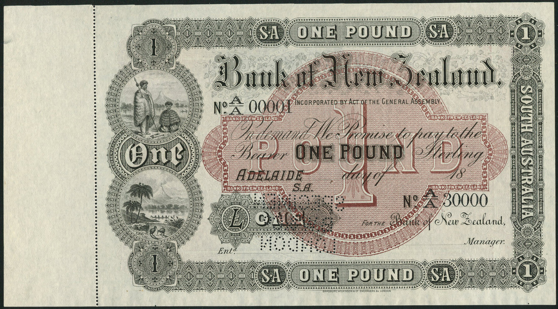 (†) Bank of New Zealand, printers archival specimen £1, Adelaide, 18- (c1873-), serial number range A/A 00001-A/A 300000, black on brown underprint, two Maoris at top left, scene with canoe and kiwi birds at low left, reverse brown and pale blue