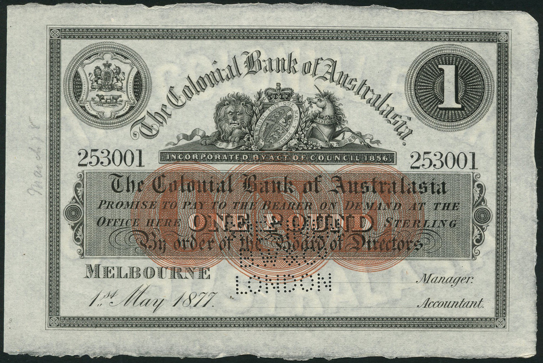 (†) Colonial Bank of Australia, specimen £1, Melbourne, 1 May 1877, serial number 253001-253001, black and white, value in red-brown central guilloche, arms top centre and top left