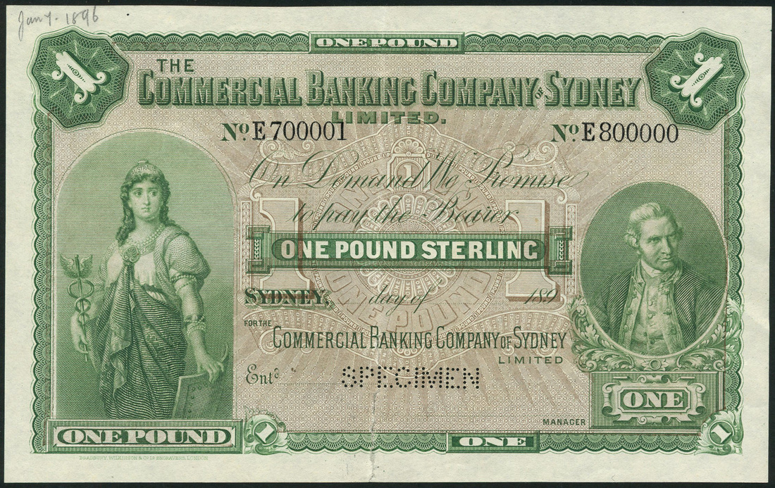 (†) Commercial Banking Company of Sydney Limited, specimen £1, Sydney, 189-, serial number E700001-E800000, green and pale beige, Captain Cook at right, maiden with caduceus at left, value at centre and at each corner, reverse green, bank building at left, view of Sydney at right