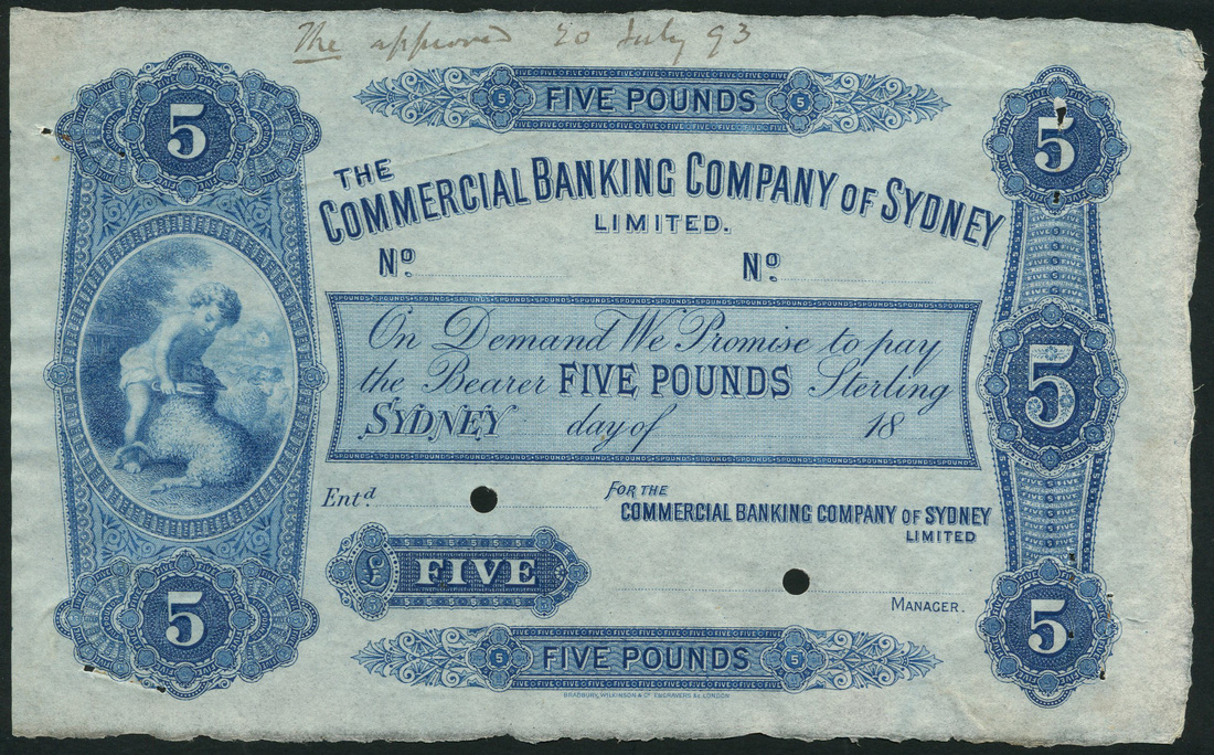 (†) Commercial Banking Company of Sydney Limited, specimen £5, Sydney, 18- (c.1893), no serial numbers, blue and white, cherub shearing sheep at right, value at centre, value at each corner