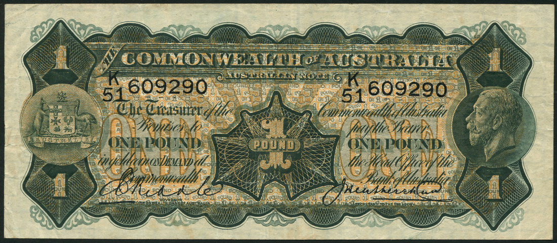 Commonwealth of Australia, £1, ND (1928), serial number K/51 609290, green and orange, value at centre and at each corner, arms at left, George V at right, Riddle-Heathershaw signatures