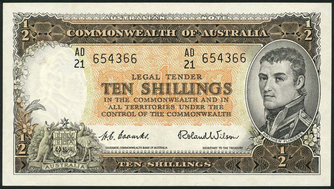 (x) Commonwealth of Australia, 10 shillings (2), ND (1954-60), serial numbers AD21 654366 and AE19 316744, brown and orange, portrait Matthew Flinders at right, coat of arms low left, Coombs/Wilson signature, reverse, Government House in Canberra