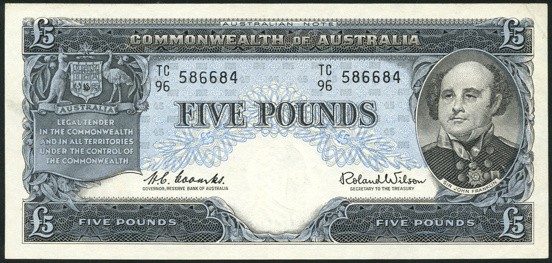 (x) Commonwealth of Australia, £5 (2), ND (1954-59), serial numbers TA77 763440 and TB10 038034, also, £5, ND (1960-65), serial number TC96 586684, all, black and light blue, portrait Sir John Franklin in circular frame at right, arms at left, reverse, livestock, agricultural produce, aboriginal shield and boomerang at centre