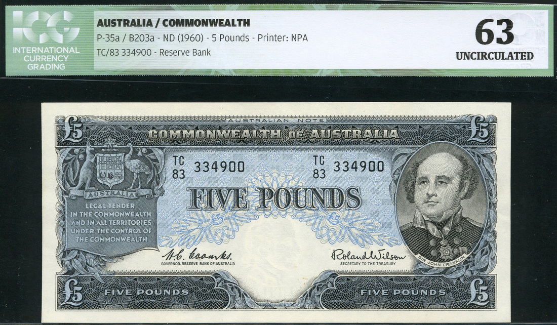Commonwealth of Australia, £5, ND (1960), serial number TC83 334900, dark grey on light blue underprint, portrait Sir John Franklin at right, arms at left, ornate border, Coombs/Wilson signature, reverse, shield and boomerang at centre, sheep, cows and agricultural produce