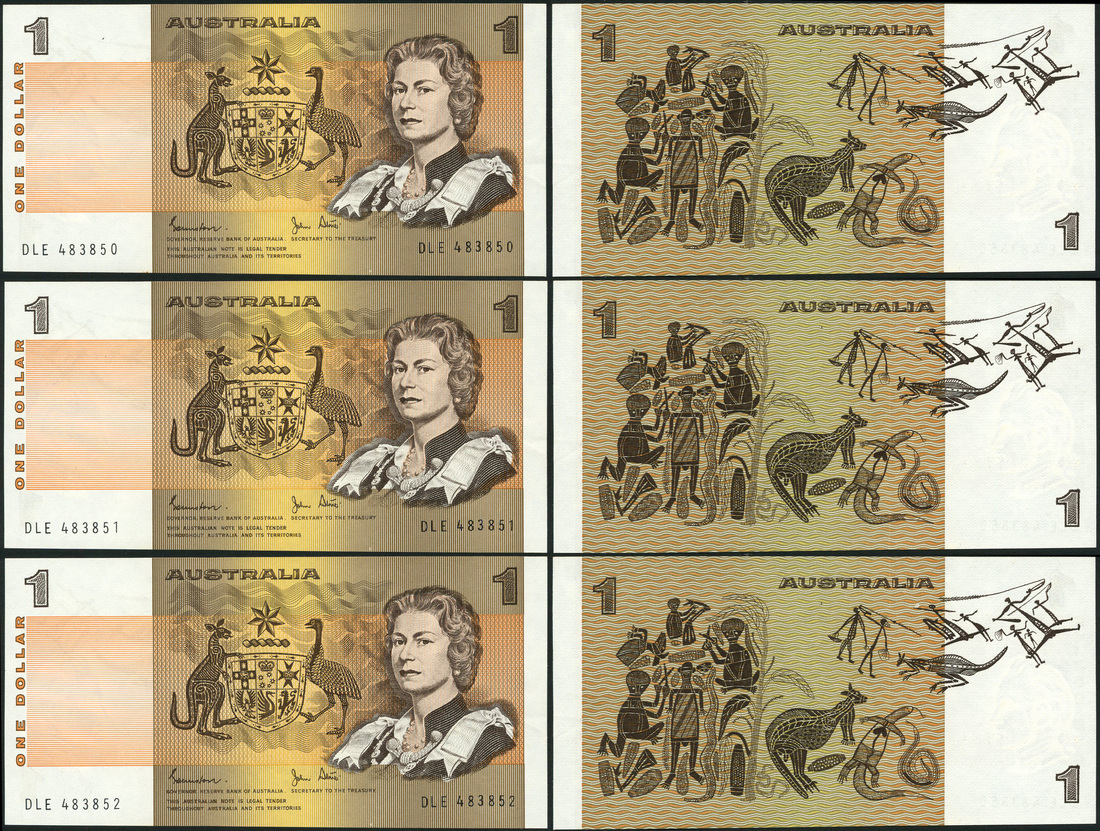 (x) Australia, $1 (3), 1974-83, consecutive serial numbers DLE 483850-2, brown, Elizabeth II at right