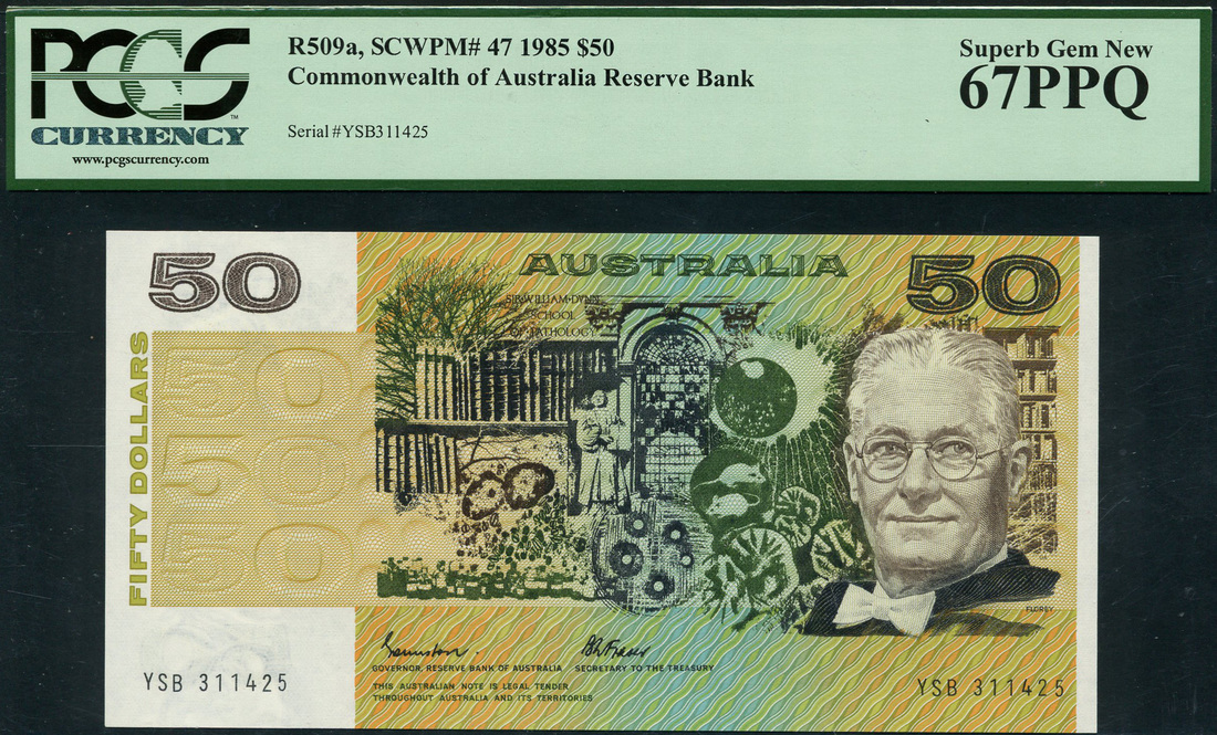 (x) Commonwealth of Australia Reserve Bank, $50, 1985, serial number YSB 311425, blue and orange green, portrait of Howard Florey at right, reverse brown and green on multicolour Clunies Ross at left