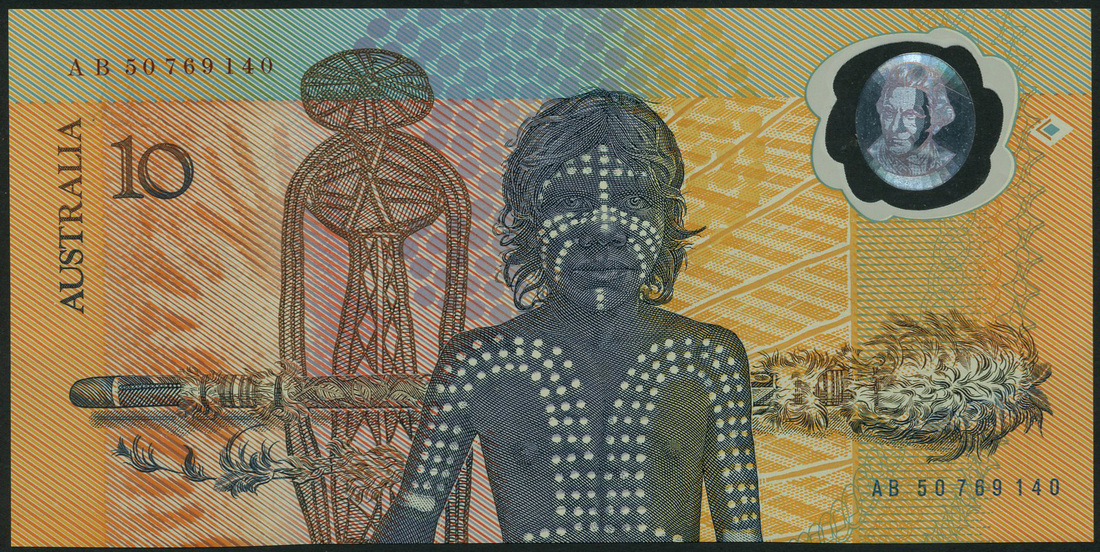 (x) Reserve Bank of Australia, $10 (2), ND (1988), serial numbers AB 18394162 and AB 50769140, green on multicolour underprint, ship in full sail at centre, large group of people in background, reverse, orange on multicolour underprint, aboriginal youth at centre
