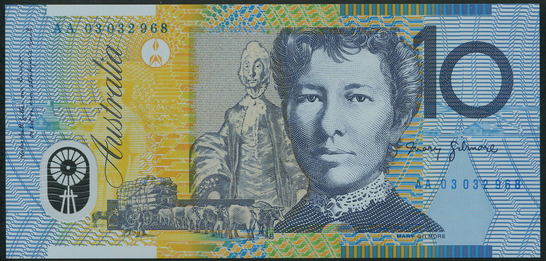 (x) Reserve Bank of Australia, $1 (4), ND (1995), serial numbers BA 02003034, BA 03008766, EA 02178629 and EA 03228517, purple, pink and orange, portrait Queen Elizabeth II at centre, also, $10, serial numbers AA 03032968, AA 03032479, DF 03506129 and DF 03547072, blue, yellow and green, portrait A B Banjo Paterson at centre left
