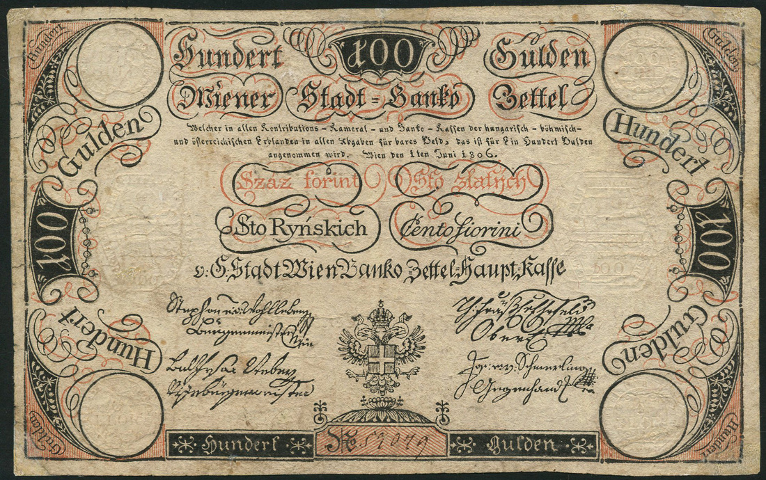Wiener Stadt Banco, Austria, 100 gulden, 1 June 1806, serial number 57079, black and white with red highlights, double headed Austro-Hungarian eagle low centre, reverse black text on white