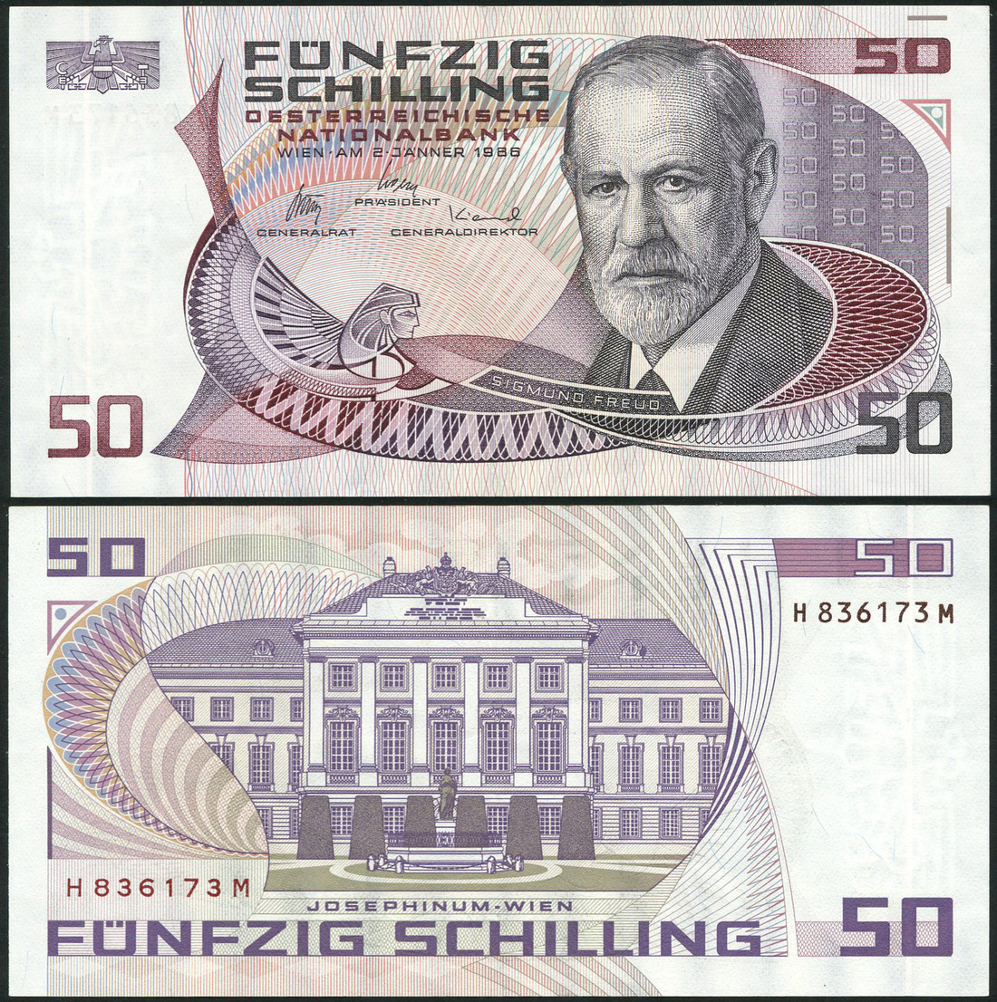 (x) Austrian National Bank, 50 schilling, 1987, serial number H836173M, purple, Freud at right
