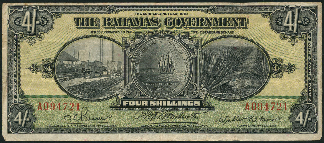 Bahamas Government, 4 shillings, 1924, serial number A094721, black on green underprint, ship seal at centre, horse cart at left, agave plants at right, value at corners, reverse green