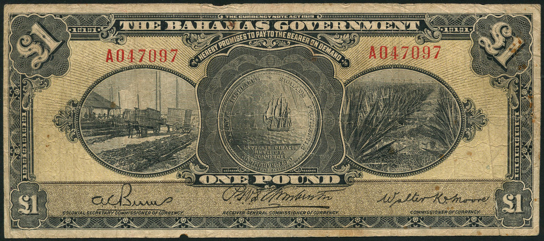 Bahamas Government, £1, 1924, serial number A047097, black on yellow and red underprint, ship seal at centre, horse cart at left, agave plants at right, value at corners, reverse orange