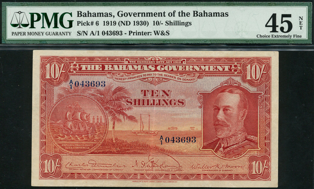 (x) Bahamas Government, 10 shillings,, ND (1919), serial number A1 043693, red, portrait King George V at right, ship seal in circular frame at left, value in each corner and at centre, bank title top centre, reverse, fruit harvesting at left, arms at centre