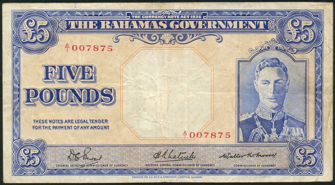 Bahamas Government, £5, ND (1944), red serial number A/1 007875, blue and pale yellow-orange, George VI at right, value at left, value at each corner, Stewart, Latreille and Moore signatures, reverse blue, green and orange, arms at left, value at right