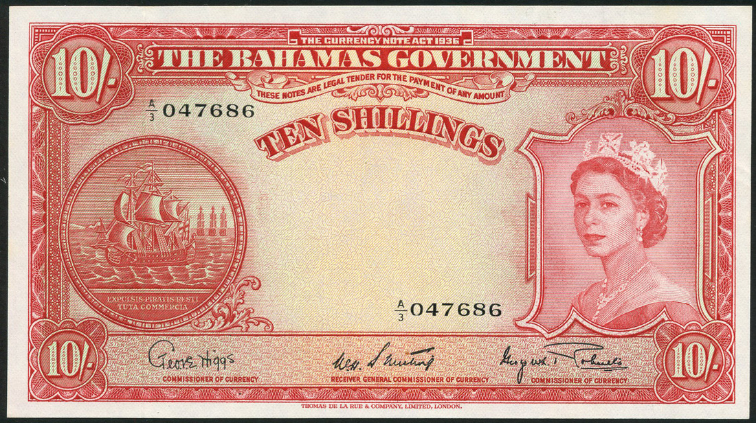 Bahamas Government, 10 shillings, ND (1963), serial number A/3 047686, red, pale green and pale orange, Elizabeth II at right, arms at left, value at centre and at each corner, Higgs, Sweeting and Roberts signatures, reverse red and white, arms at left, value at right