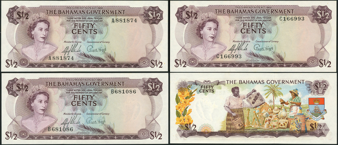 (x) Bahamas Government, 50 cents (3), law of 1965, prefixes A,B and C, purple, Elizabeth II at left
