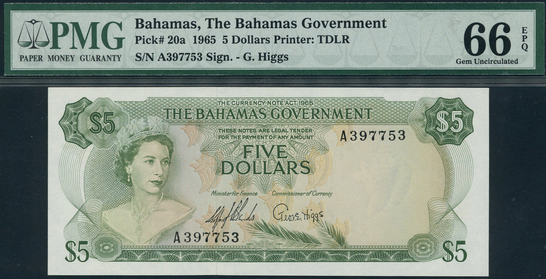 Bahamas Government, $5, ND (1965), serial number A397753, green on pale yellow underprint, portrait Queen Elizabeth II at centre left, value in each corner and at centre, reverse, Government House