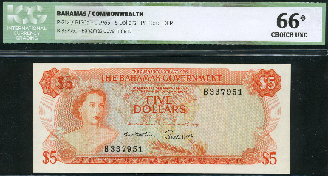 Bahamas Government, $5, ND (1965), serial number B337951, orange on light green underprint, portrait Queen Elizabeth II at left, value in each corner and at centre, reverse, elder flowers at left, Columbus statue outside Government House at centre, arms at right