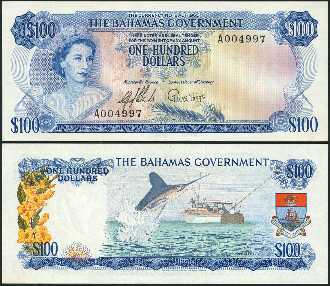 (x) Bahamas Government, $100, 1965, serial number A004497, blue on multicoloured, Elizabeth II at left wearing King George IV’s state diadem, value at each corner, reverse blue on multicolour, blue marlin and fishing boat at centre, arms at right, Stafford Lofthouse Sands and George.V.E. Higgs signatures