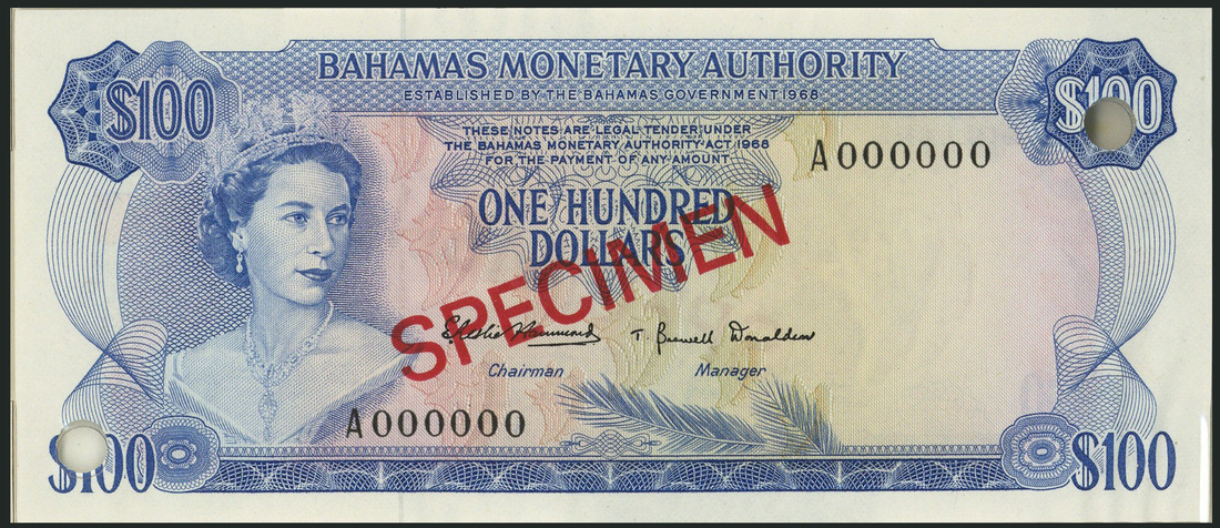 (x) Bahamas Monetary Authority, a blue leather album, 1969, comprising punch holed specimen $1/2, serial number C000000, $1, serial number G000000, $3, serial number B000000, $5, serial number D000000, $10, serial number B000000, $20, serial number B000000, $50, serial number A000000, $100, serial number A000000, all with Elizabeth II portrait at right