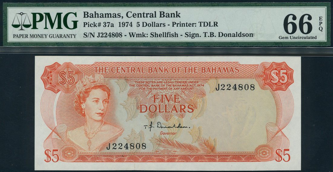 Central Bank of the Bahamas, $5, ND (1974), serial number J224808, orange on light tan and olive green, portrait Queen Elizabeth II at left, value in each corner, bank title top centre, reverse, Government House