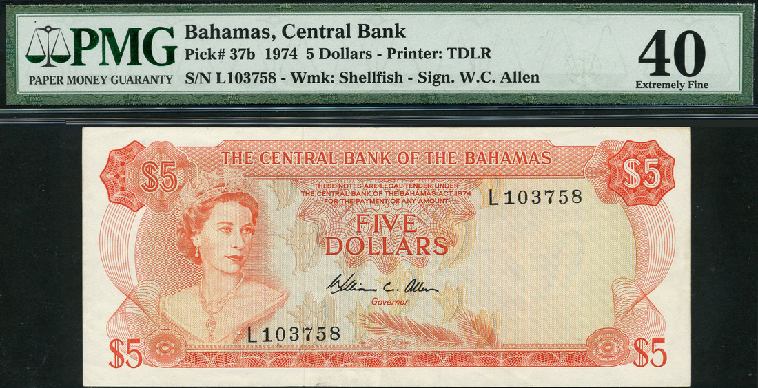 (x) Central Bank of the Bahamas, $10, ND (1974), serial number J219194, black on multicolour underprint, Elizabeth II at left, value at each corner