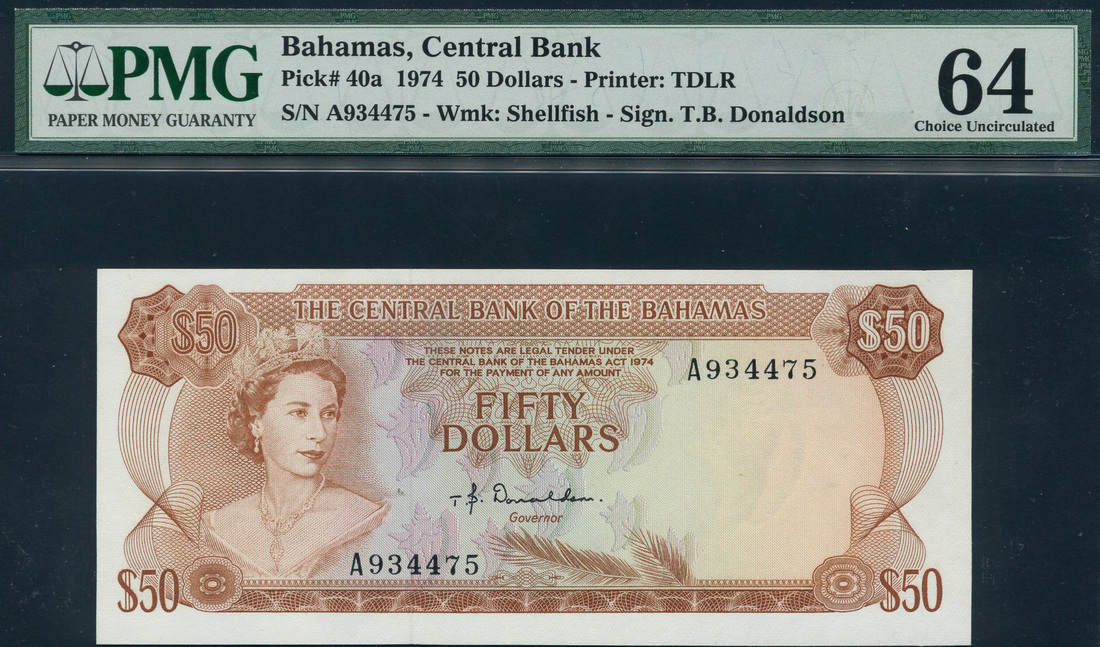 Central Bank of the Bahamas, $50, 1974, serial number A934475, brown on multicolour, Queen Elizabeth II at left, value in each corner, reverse, multicolour, fruit market, and dock side scene, T.B Donaldson