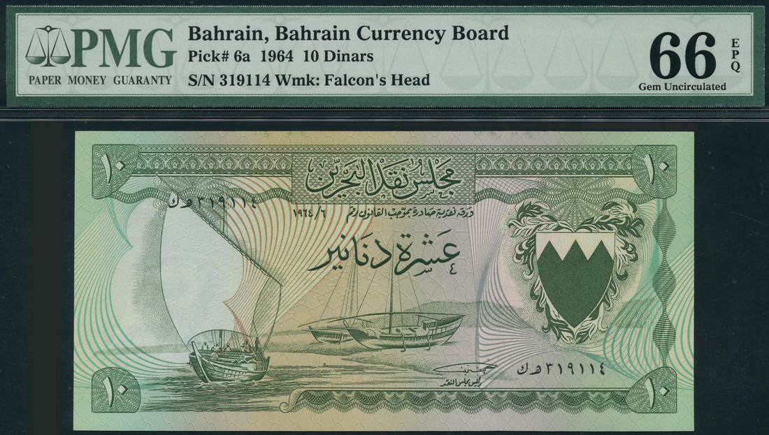 Bahrain Currency Board, 10 dinars, 1964, serial number 319115 (consecutive to previous lot), green on pale orange and pink, arms at right, boats at centre and left, value in each corner, reverse, aerial view of Isa Town