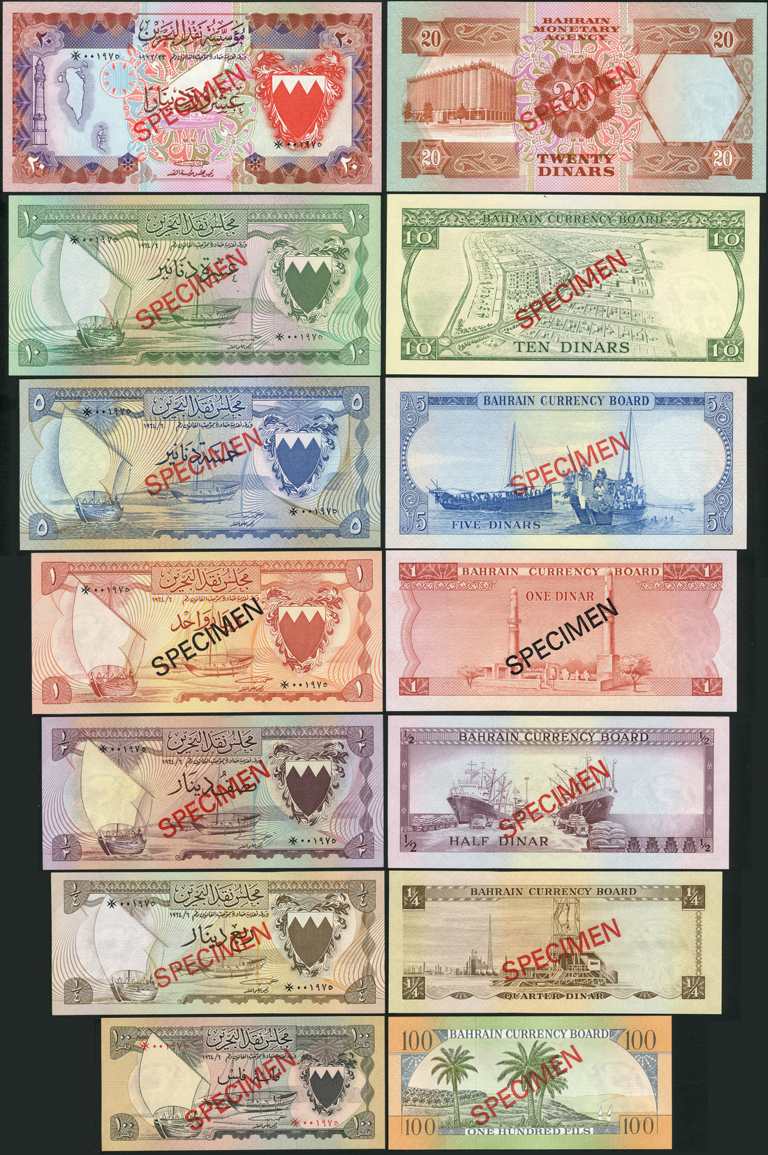 (x) Bahrain Monetary Agency, presentation pack 100 fils, 1/4, 1/2, 1, 5, 10 and 20 dinars, all with serial numbers 001975 and Maltese cross, a Franklin Mint production