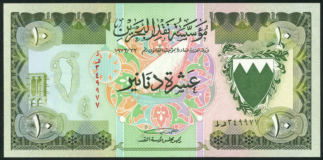 (x) Bahrain Monetary Agency, 10 dinars, 1979, serial number 349977, green on multicolour underprint, arms at right, dhow in colourful panel at centre, minaret at left, reverse, ship in harbour at left, value in each corner and at centre with bank title above