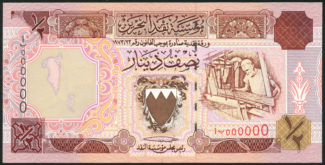 Bahrain Monetary Agency, specimen 1/2 dinar, 1973/23 (1996), zero serial numbers, brown on mainly pink and yellow underprint, arms at centre, map at left, blind weaver and loom at right, reverse, Aluminium factory