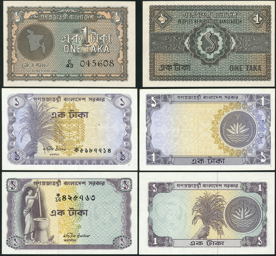 (x) Bangladesh, 1 taka, 1972 , 1973 (3), purple and ochre, hand and rice plant