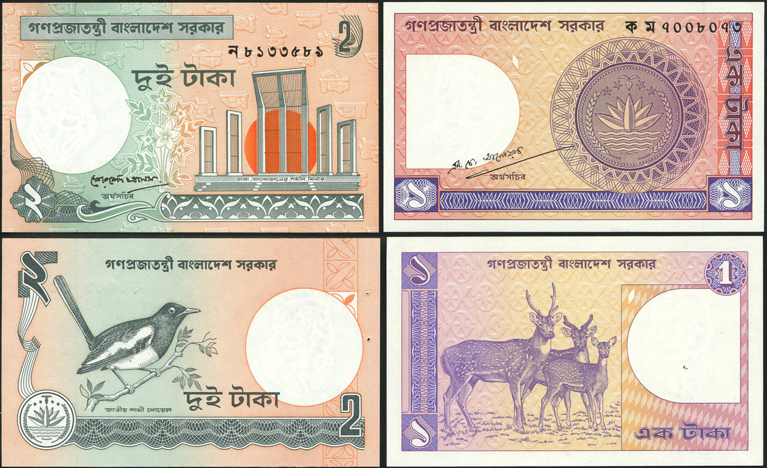 (x) Bangladesh, 1 taka (11), 1979-88 purple and orange, arms at right