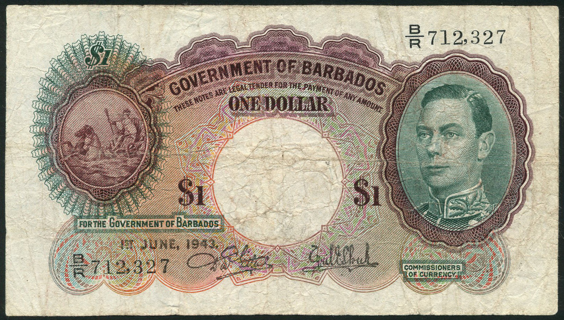 (x) Government of Barbados, $1, 1 June 1943, serial number B/R 712,327, brown and green on multicolour, portrait King George VI at left, seahorses pulling Neptune in ornate circular panel at right, reverse, brown, blue and orange, value at left and right in elaborate panel