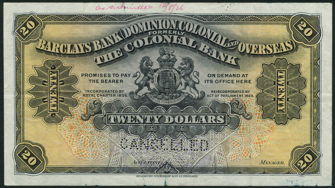 (†) Barclays Bank (Dominion, Colonial and Overseas), Barbados, specimen proof $20 (2), ND (1926), no serial numbers, no signatures, no Letter at upper right, black on grey and yellow underprint, coat of arms at centre, value in guilloches at left and right and in four corners, reverse blue, pale blue and pale green, arms at centre, perforated CANCELLED